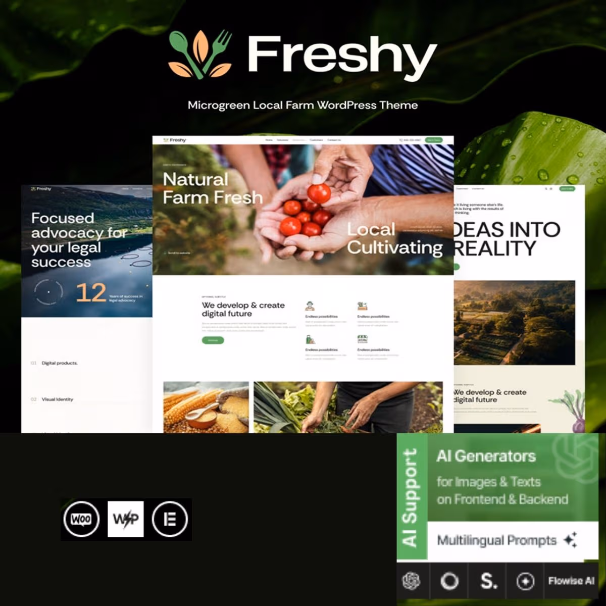 Freshy provides a WordPress theme for the growing microgreen and local fresh produce market. The vibrant green design communicates freshness and health while supporting the direct-to-consumer sales model common in local farming businesses.