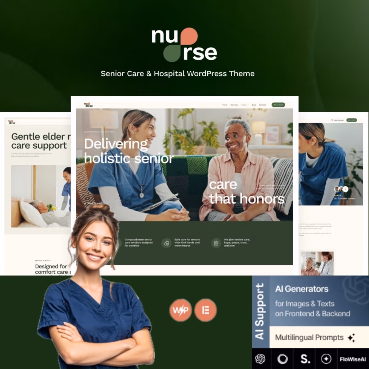 Nurse provides senior care and healthcare facilities with a WordPress theme that communicates compassion, professionalism, and trust. The theme uses warm design elements and accessible layouts to reassure families while presenting care services clearly.
