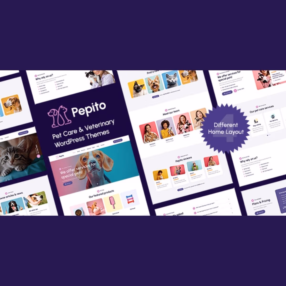 Pepito provides a warm, pet-friendly design language created for businesses in the animal care industry. The theme addresses the web presence needs of veterinary clinics, pet shops, grooming salons, boarding facilities, and animal rescue organizations with purpose-built sections and a welcoming visual approach.