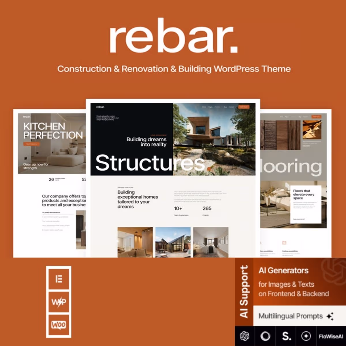Rebar provides construction and renovation businesses with a WordPress theme that communicates strength, reliability, and craftsmanship. The theme uses bold design elements appropriate for the building industry while maintaining professional business presentation.