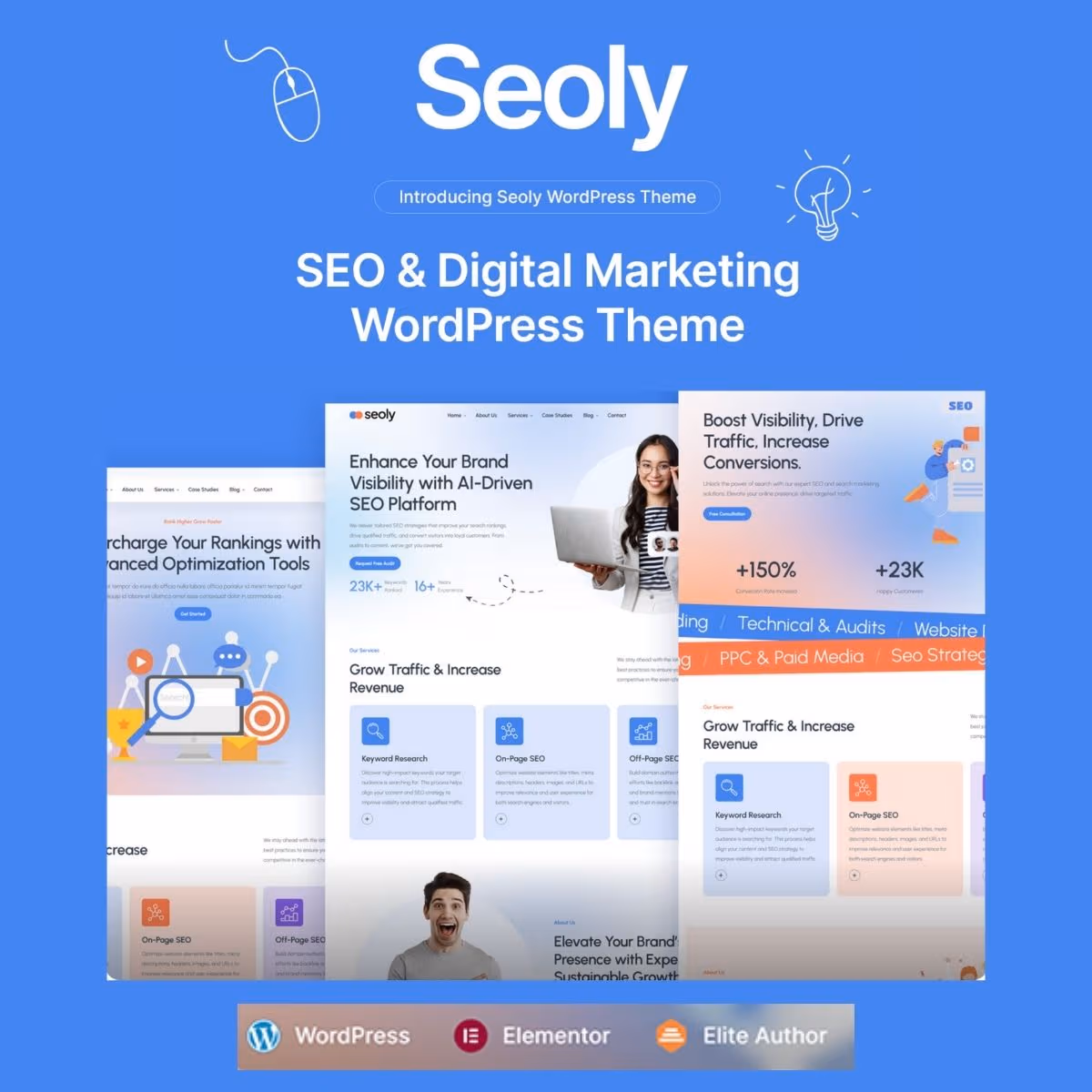 Seoly provides a purpose-built WordPress theme for SEO and digital marketing professionals. The theme combines marketing industry knowledge with conversion-focused design, helping agencies present their services, demonstrate results, and convert website visitors into client inquiries.